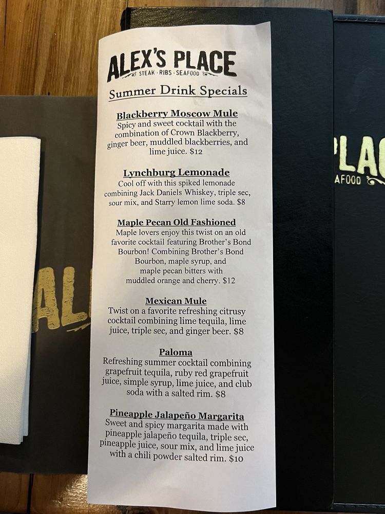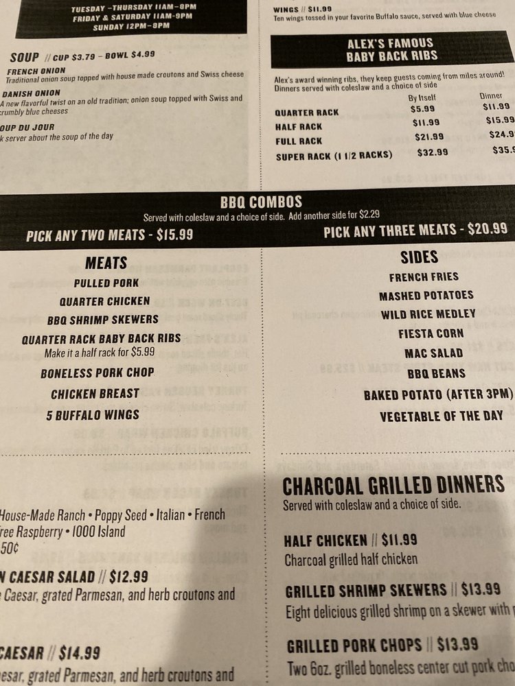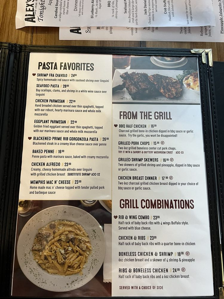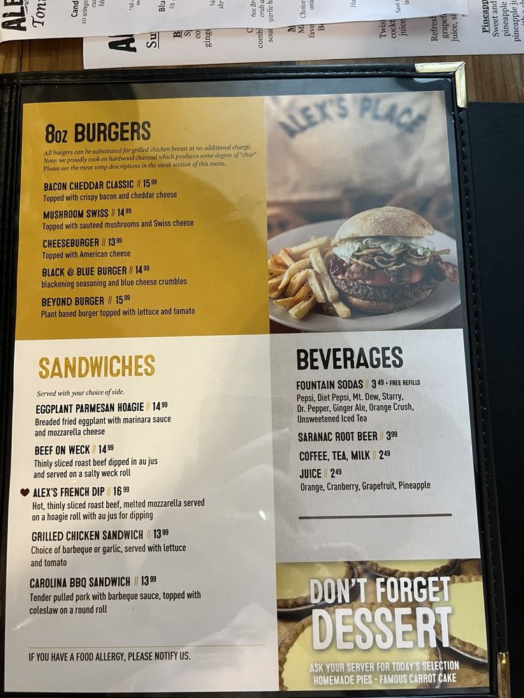 Welcome to Alex's Place, a beloved restaurant in Batavia, NY, offering a blend of steakhouses, American, and seafood cuisine. This casual spot offers a range of amenities, including reservations, delivery, and takeout, making it convenient for all. With an extensive menu featuring many vegetarian options, Alex's Place caters to various dietary preferences. The restaurant's location is at 8322 Park Rd, and you can reach them at (585) 344-2999.